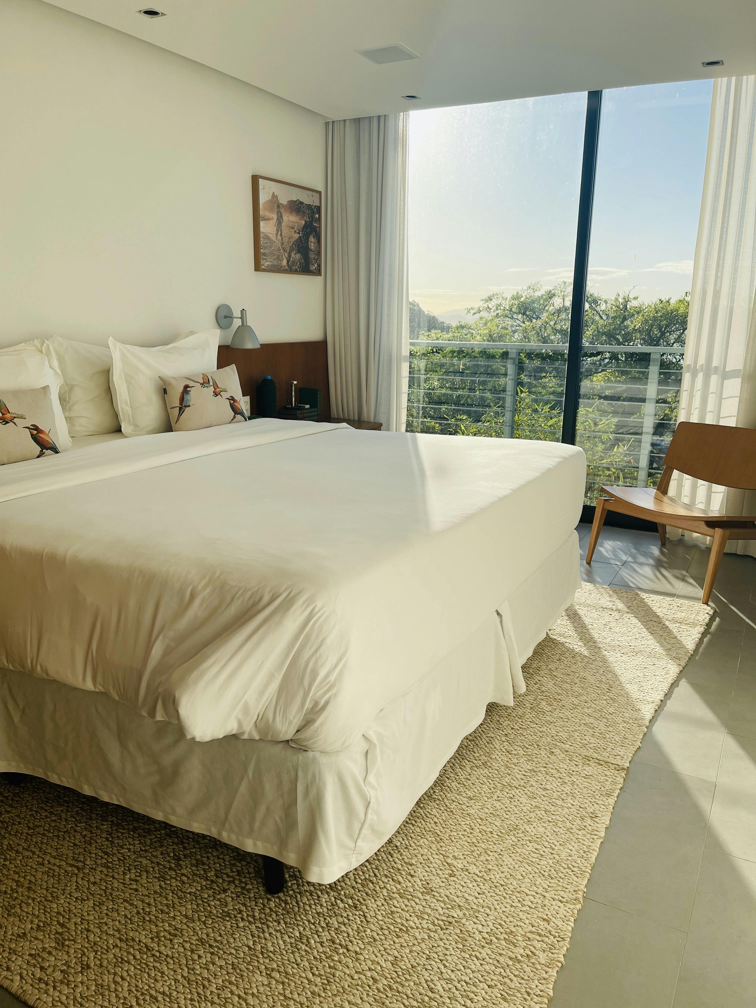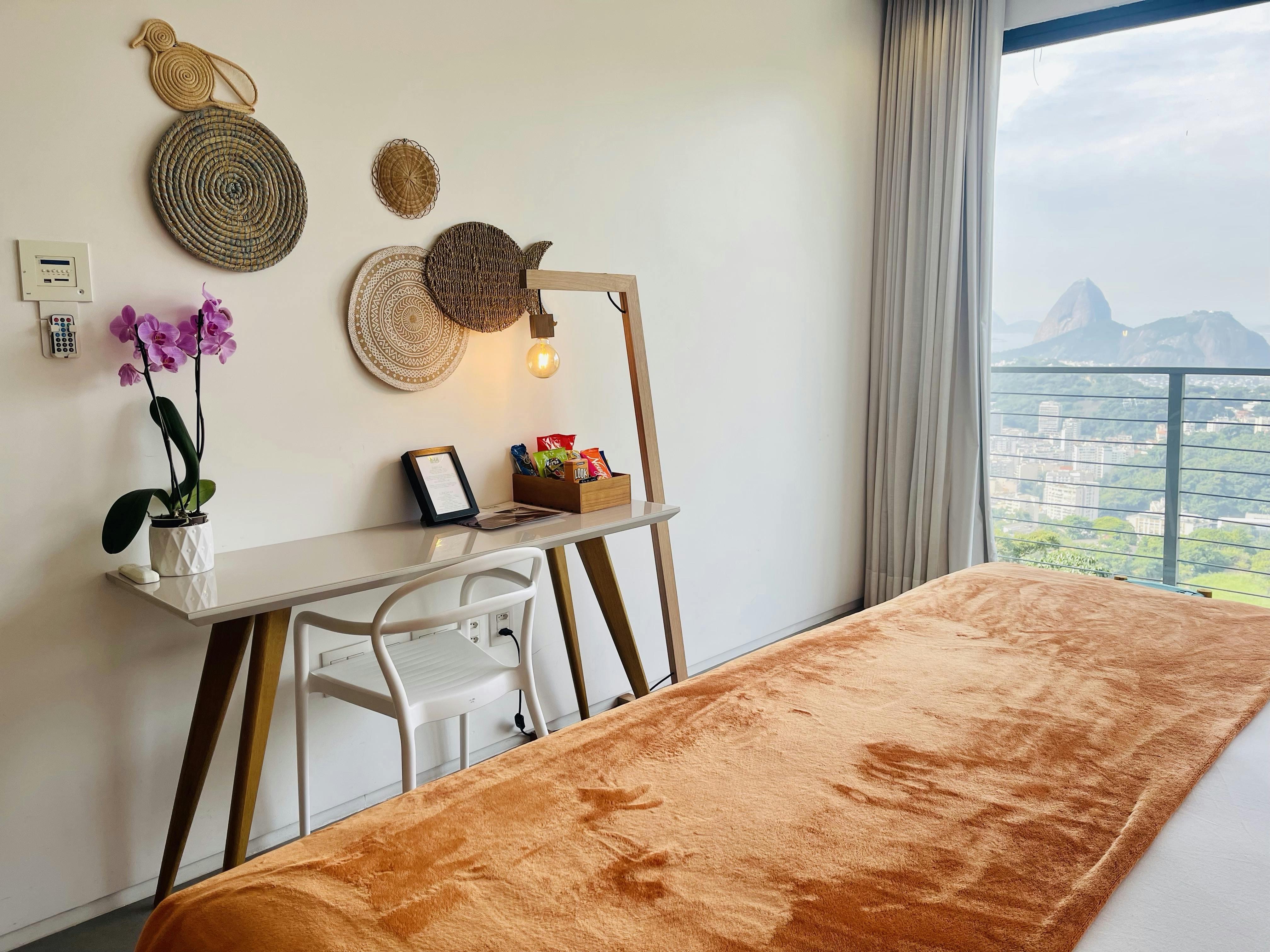 Chambre Deluxe de 20m2 au confort exceptionnel (literie de luxe, bureau, chaise, grande penderie, musique Bluetooth, A/C, frigo, coffre, douche pluie) et un design brésilien unique et chaleureux.