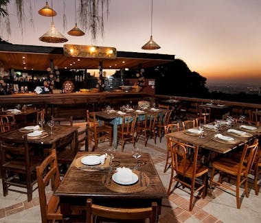 Culinária brasileira caseira e cachaça servidas em restaurante rústico com jardins e vista para o Rio.