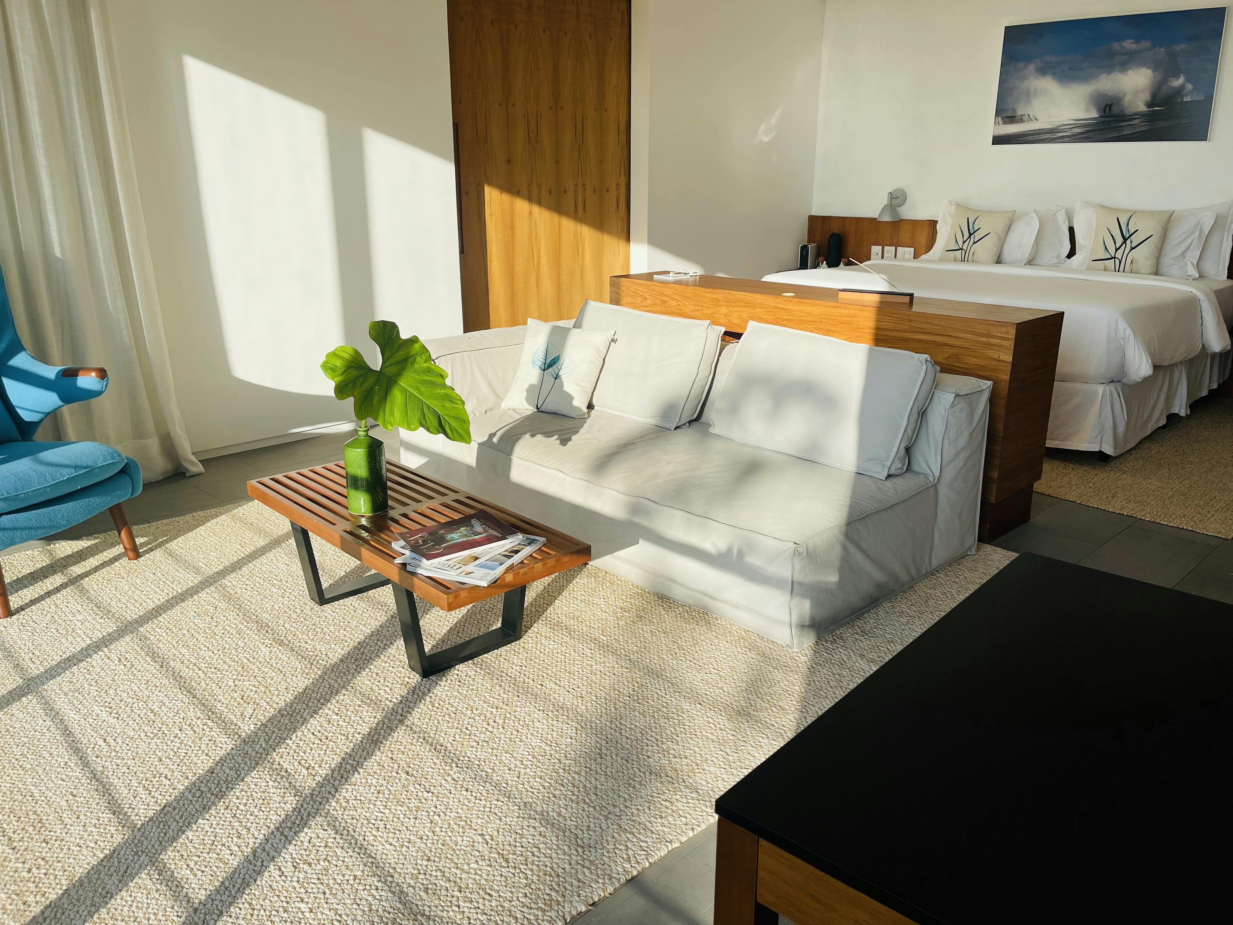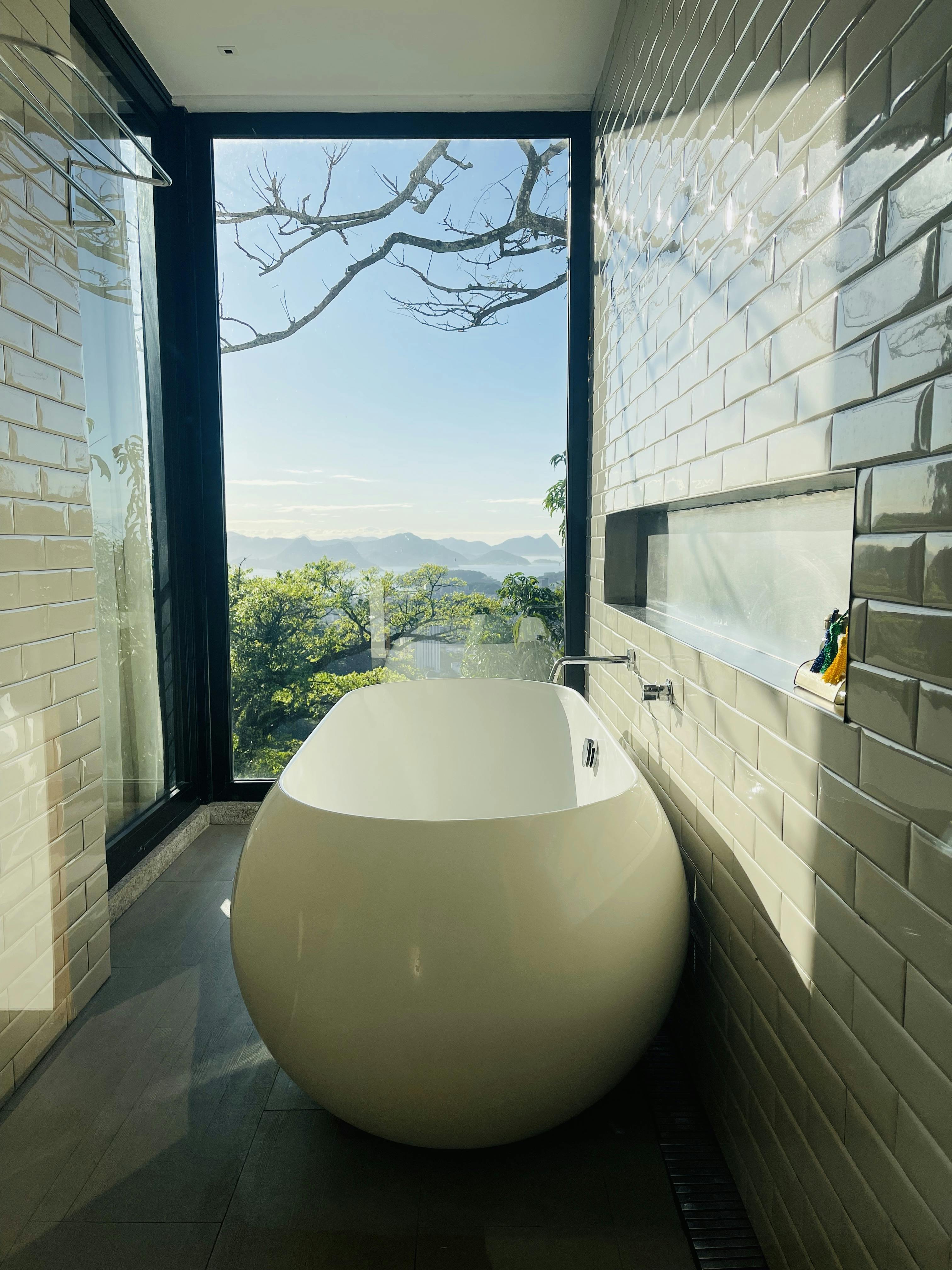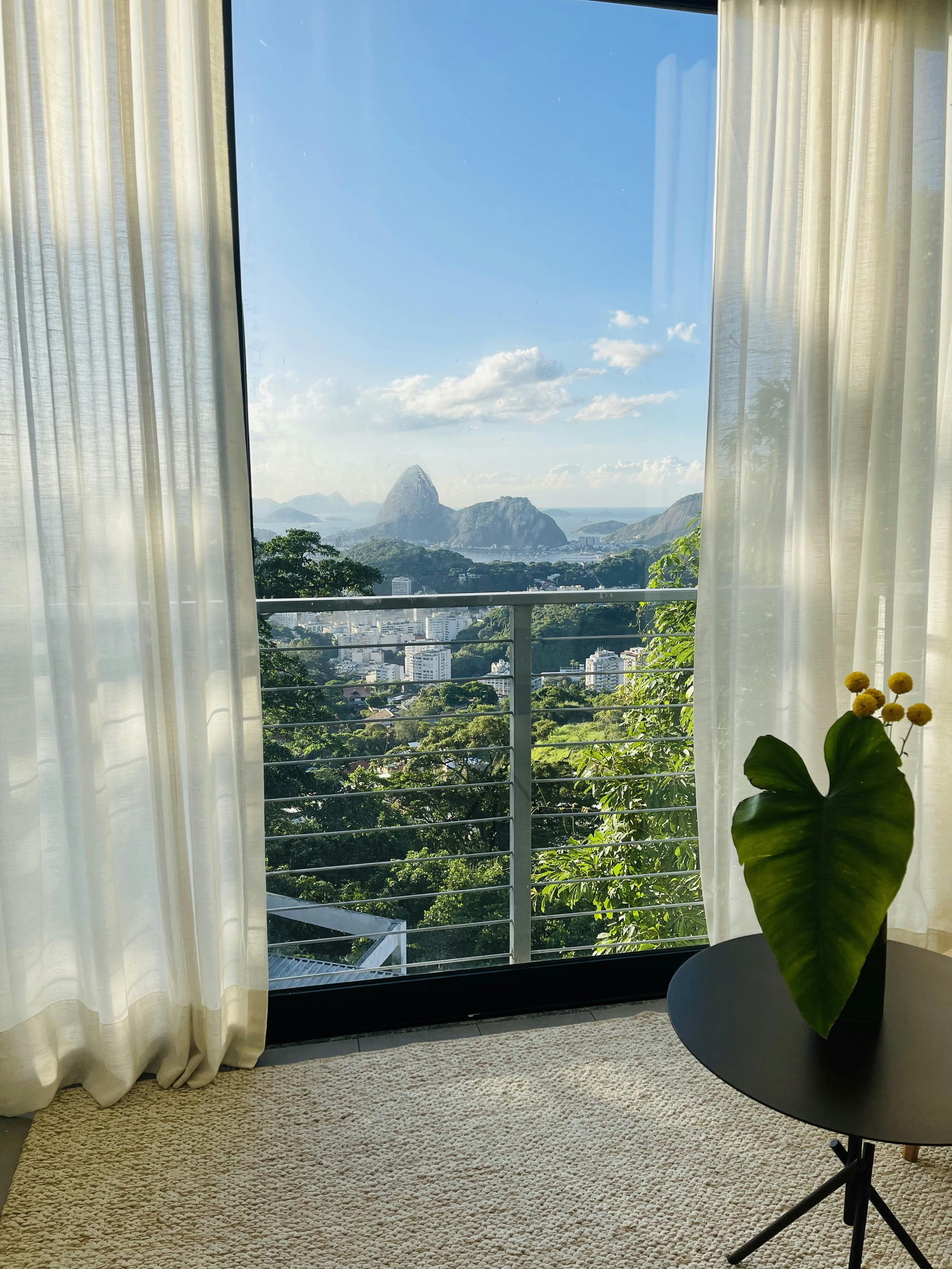 Suite Deluxe de 40m2 com conforto excepcional: sala de estar, secretária, roupa de cama luxuosa, roupeiro grande, música Bluetooth, frigorífico, cofre, chuveiro de efeito chuva e banheira, café Nespresso. Esta Suíte Deluxe oferece uma vista panorâmica espetacular da selva, da montanha, do mar e do Pão de Açúcar.