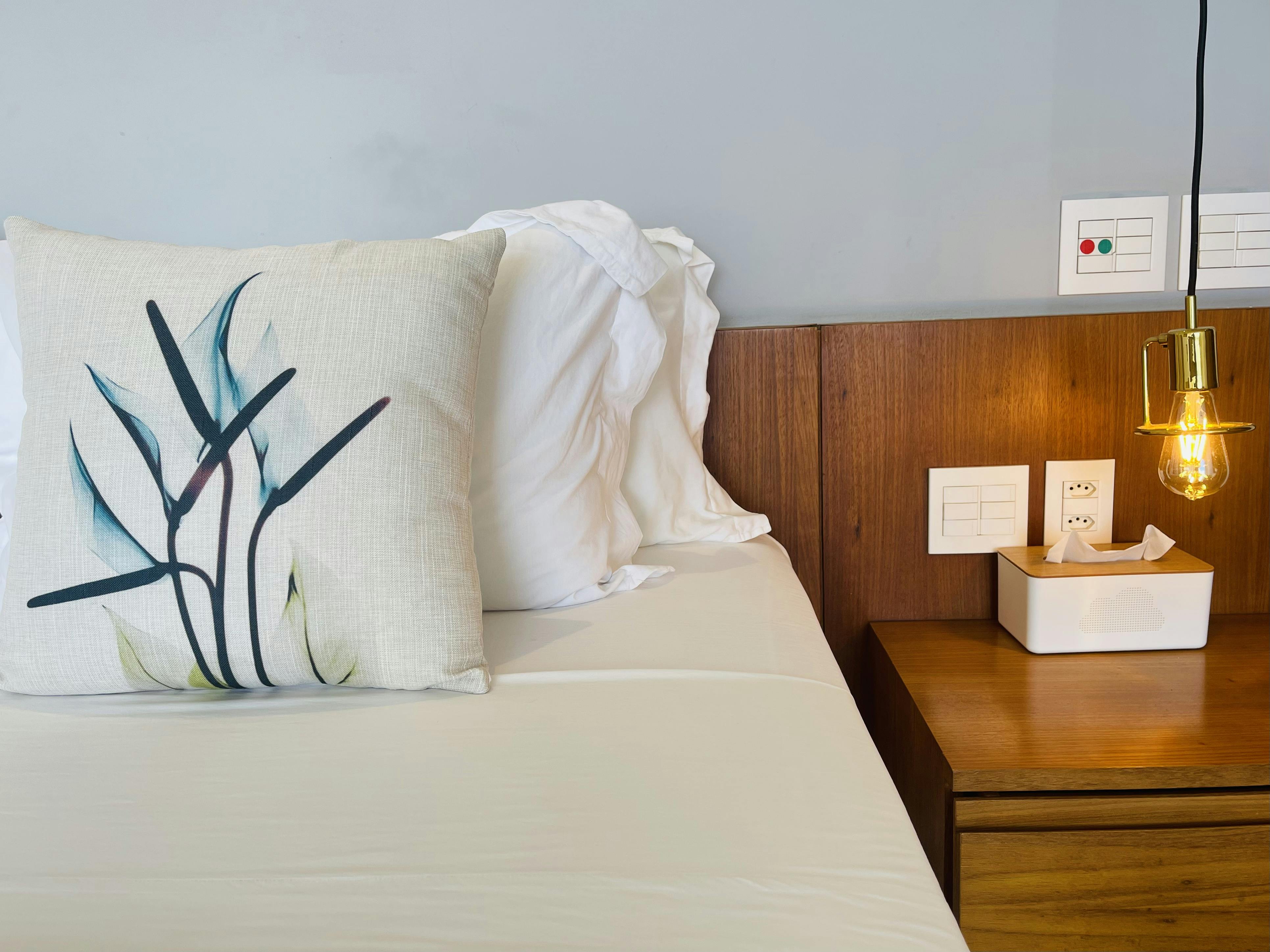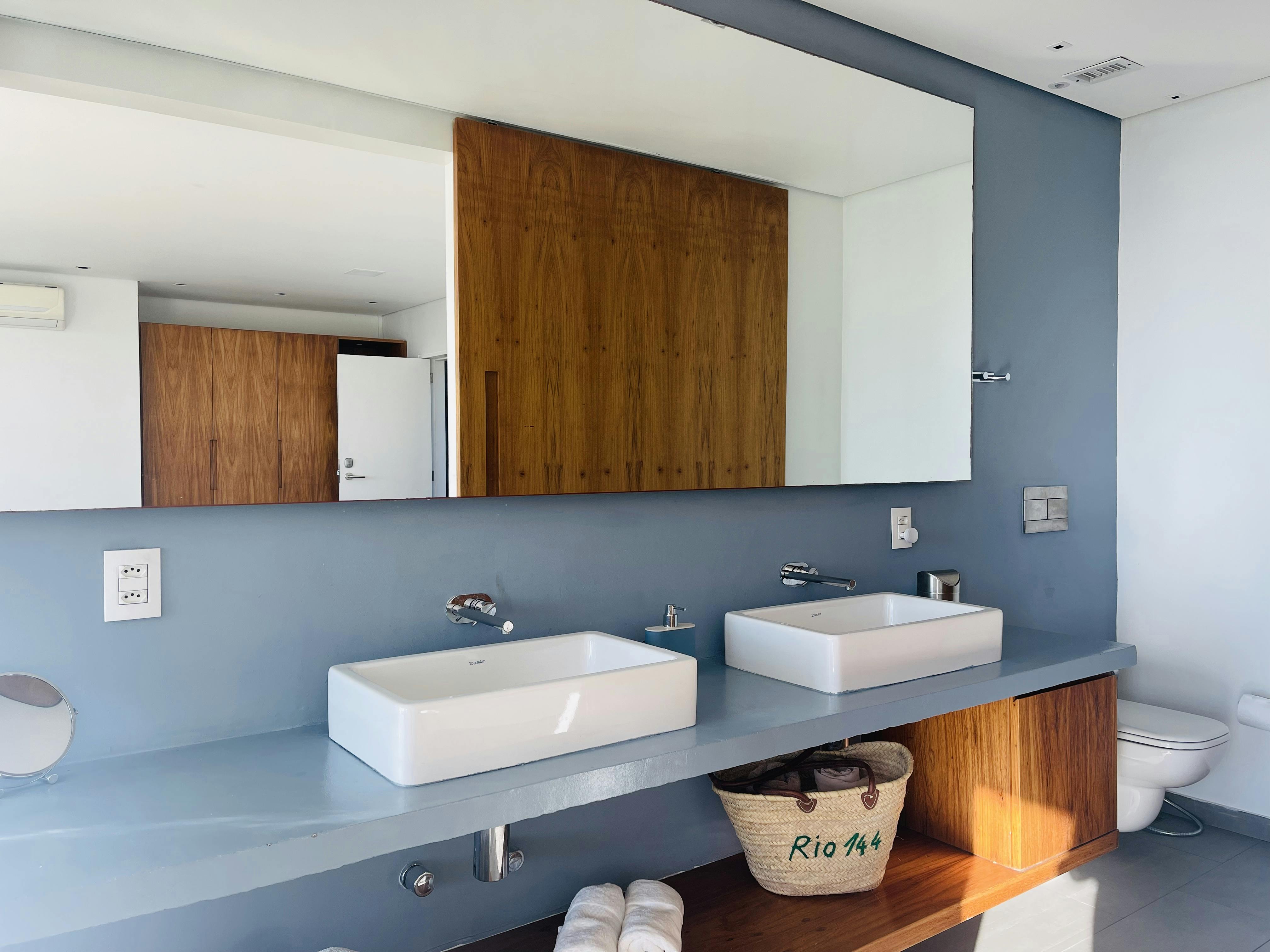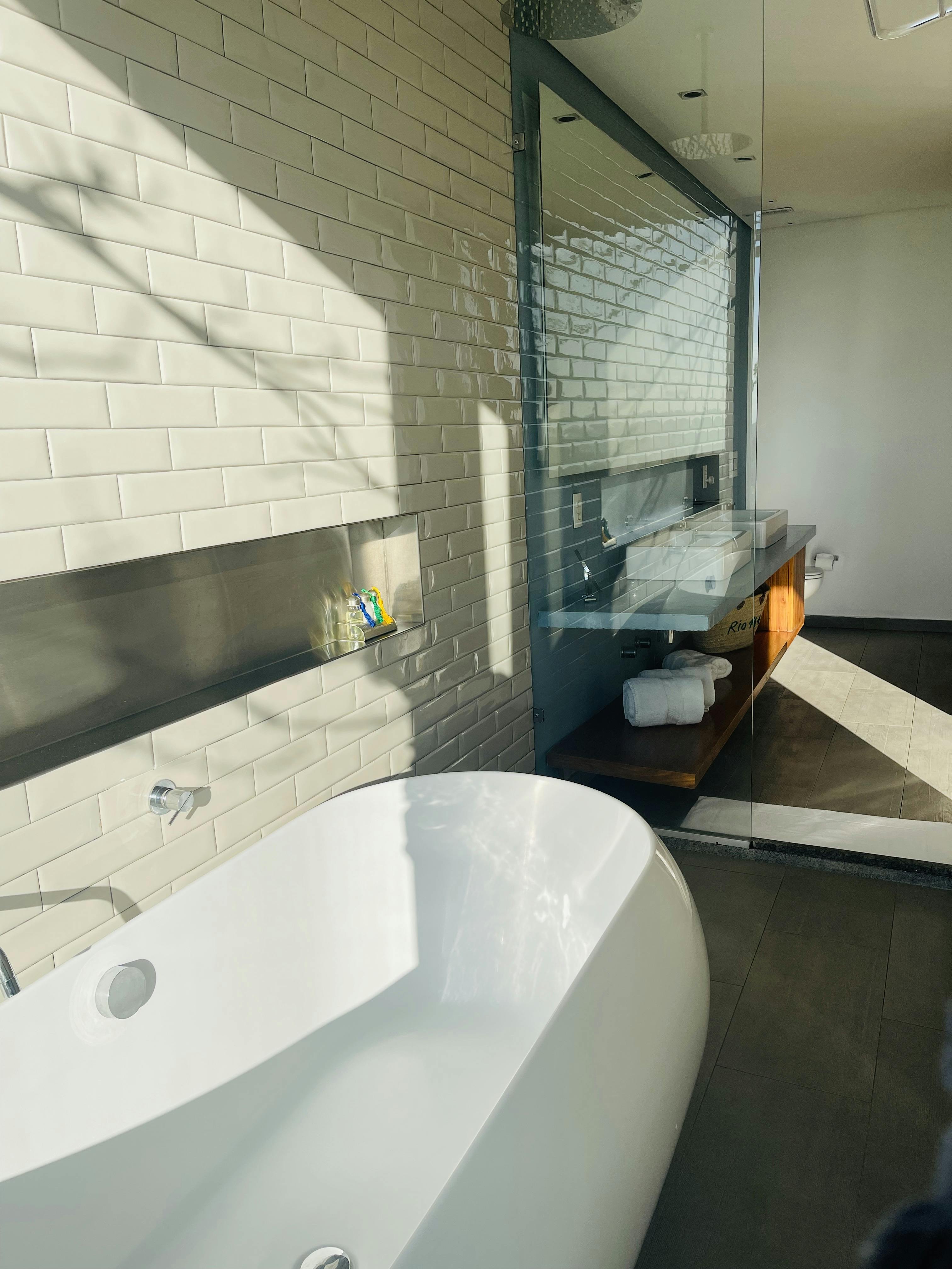 Suite Deluxe de 40m2 com conforto excepcional: sala de estar, secretária, roupa de cama luxuosa, roupeiro grande, música Bluetooth, frigorífico, cofre, chuveiro de efeito chuva e banheira, café Nespresso. Esta Suíte Deluxe oferece uma vista panorâmica espetacular da selva, da montanha, do mar e do Pão de Açúcar.